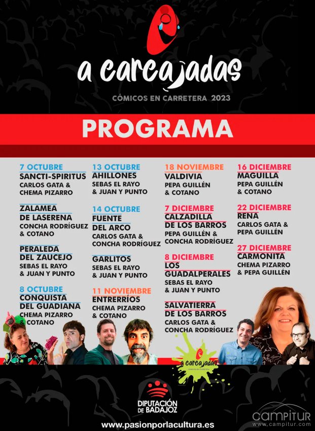 "A carcajadas: cómicos en carretera", es un programa itinerante que da respuesta a las demandas culturales de nuestras poblaciones proponiendo actividades culturales interesantes, variadas y de calidad en las mismas, por pequeñas o alejadas que estén de los núcleos urbanos más importantes, a lo que se añade la puesta en valor del trabajo y el talento de los cómicos extremeños, que se traduce en la promoción de su actividad profesional y la activación económica de los municipios.